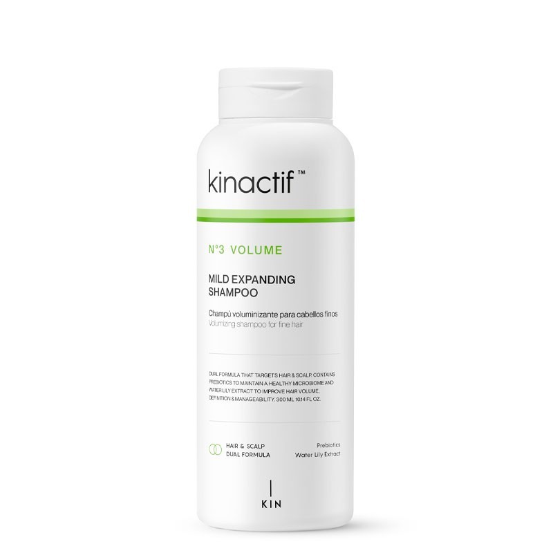Kinactif Volume Mild Expanding Shampoo 300 ml: Reinigt sanft feines, kraftloses Haar und verleiht ihm Fülle und Elastizität. Ihr Haar sieht weich und glänzend aus, ohne Frizz. Es ist außerdem vegan und enthält Inhaltsstoffe wie Seerosenextrakt zur Stärkung des Haares.