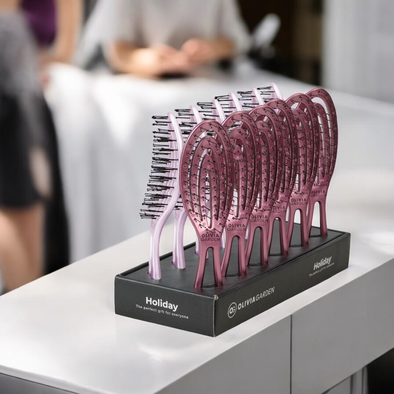Dieser Olivia Garden Präsentationsständer ist die ideale Wahl für alle, die ein hochwertiges und umweltfreundliches Werkzeug suchen. Jede Bürste besteht aus recyceltem Kunststoff* und ist somit umweltfreundlich und verantwortungsvoll. Die Farben Iced Rosé und Iced Berry machen sie zudem zu einer attraktiven und modernen Option.
