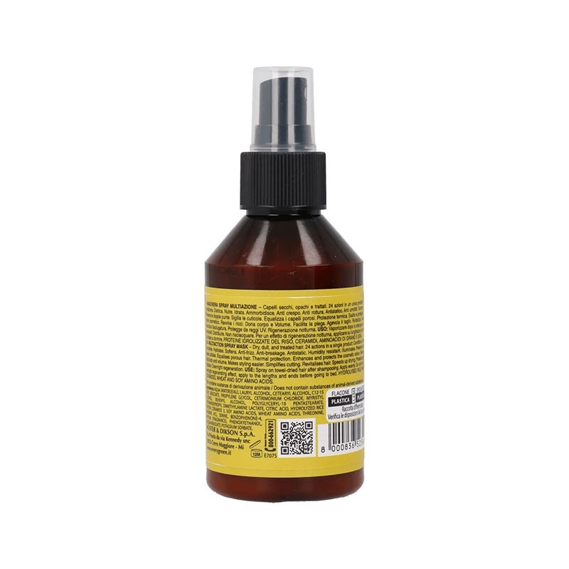 Multi-action spray mask without rinsing , 24 actions for 24 hours, ideal for dry, dull and treated hair. Vegan product. Without silicones. With UV filter.