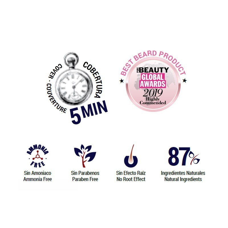 Semi- permanent color with adjustable coverage in shampoo format applicable to hair, beard and mustache . Fixed in just 5 minutes with a natural finish (intense finish with 10 minutes of exposure). No root effect as it progressively disappears with washing.