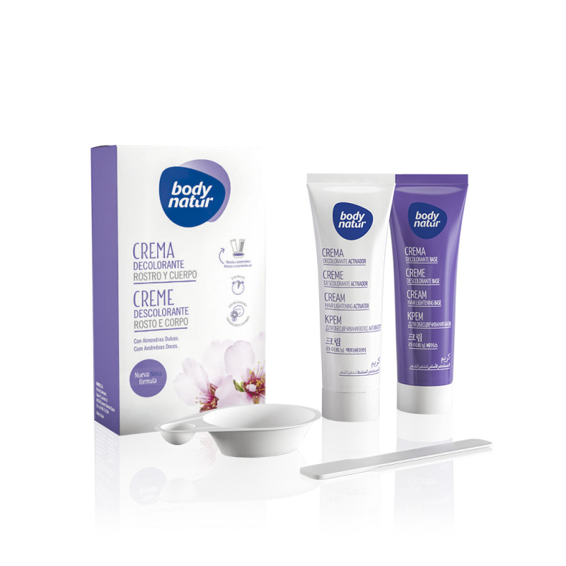 CON ALMENDRAS DULCESNueva fórmula¡Mezcla y sorpréndete!Enriquecida con Almendras Dulces, la crema decolorante Body Natur presenta su nueva fórmula que cambia de color cuando la mezcla está lista. Logra de forma fácil, eficaz y suave una decoloración de larga duración con un resultado natural que permite disimular el vello facial y corporal, que no se desea eliminar.Dermatológicamente testado.