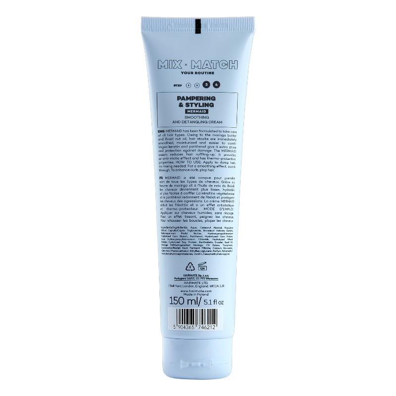 O creme desembaraçante universal Hairmate Mermaid é um produto multifuncional que hidrata, suaviza e protege instantaneamente os cabelos, graças à sua fórmula com manteiga de moringa, óleo de castanha-do-pará e queratina vegana.
