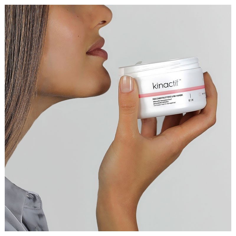A Máscara 2 em 1 Reconstrutora Kinactif Nº2 Repair funciona como condicionador ou tratamento intensivo dependendo do tempo de exposição.